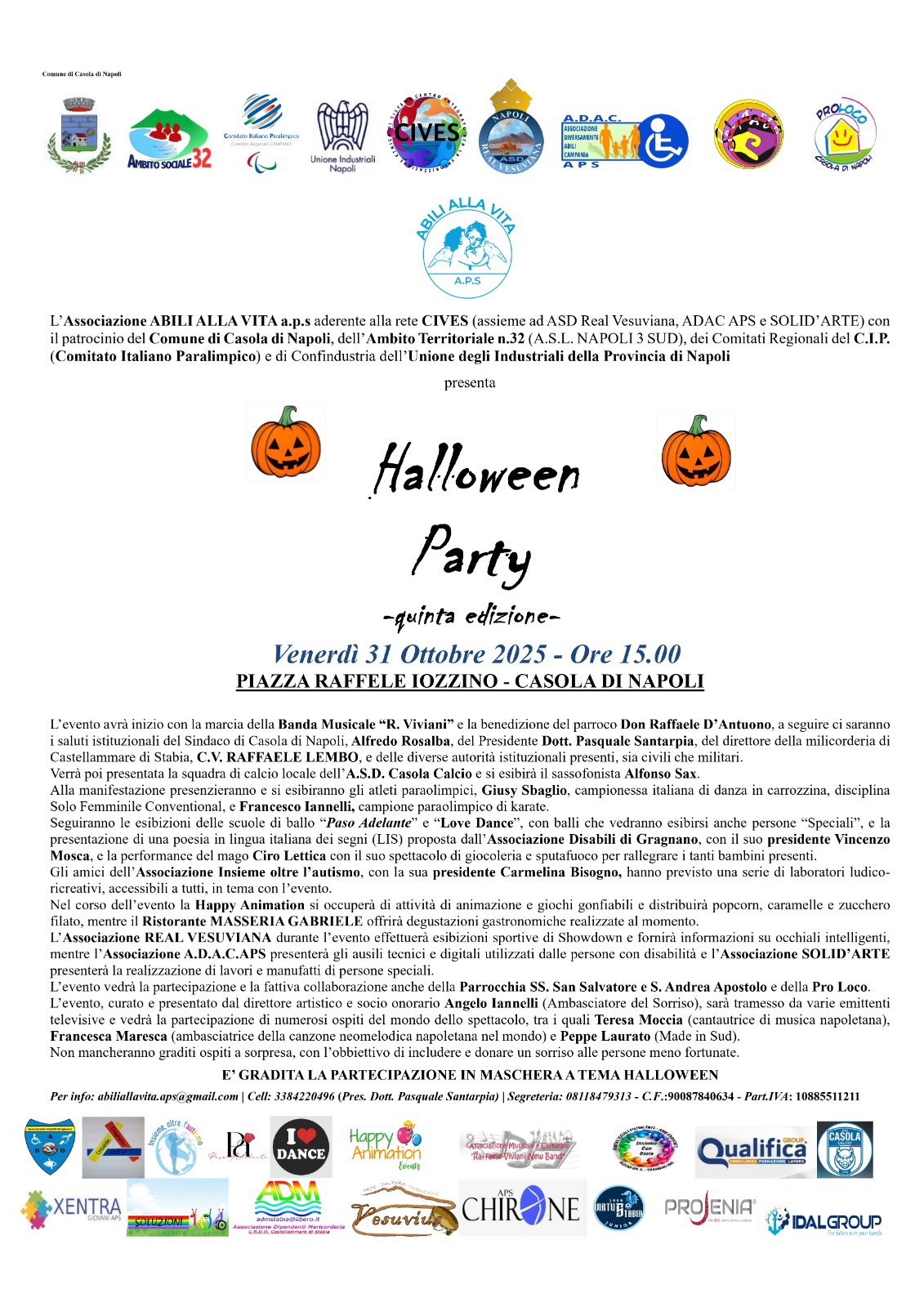 La quinta edizione di “Halloween Party“, l’evento tanto atteso dedicato all’inclusione sociale, si terrà venerdi 31 ottobre a partire dalle 15;30 in Piazza Iozzino di Casola di Napoli. Organizzato dall’associazione Abili Alla Vita A.P.S., aderente alla rete Cives in collaborazione ad Asd Real Vesuviana , Adac Aps e Solid’arte) con il patrocinio del Comune di Casola di Napoli dell’Ambito Territoriale n.32 (A.S.I. Napoli3 Sud ) , dei Comitati Regionali del C.I.P (Comitato Italiano Paraolimpico) e di Confindustria dell’Unione degli Industriali della Provincia di Napoli in collaborazione con altre realtà locali un evento unico che celebra la diversità e la solidarietà attraverso attività sportive, spettacoli e momenti di divertimento. La cerimonia culminerà con la consegna del prestigioso Premio “Eccellenza nel Sociale “,