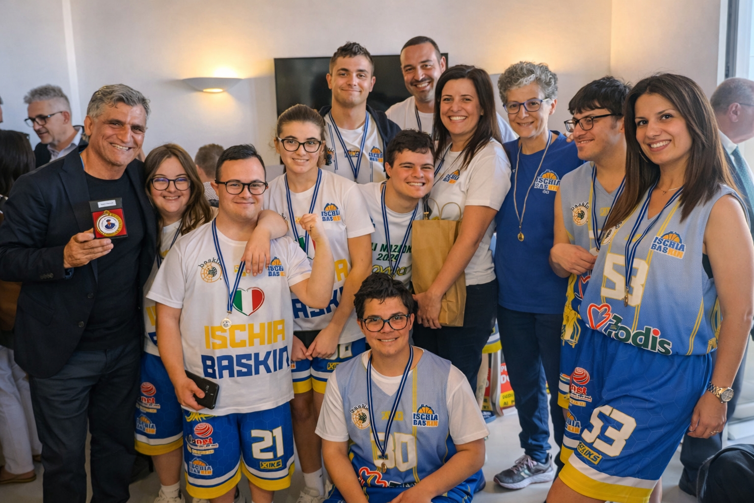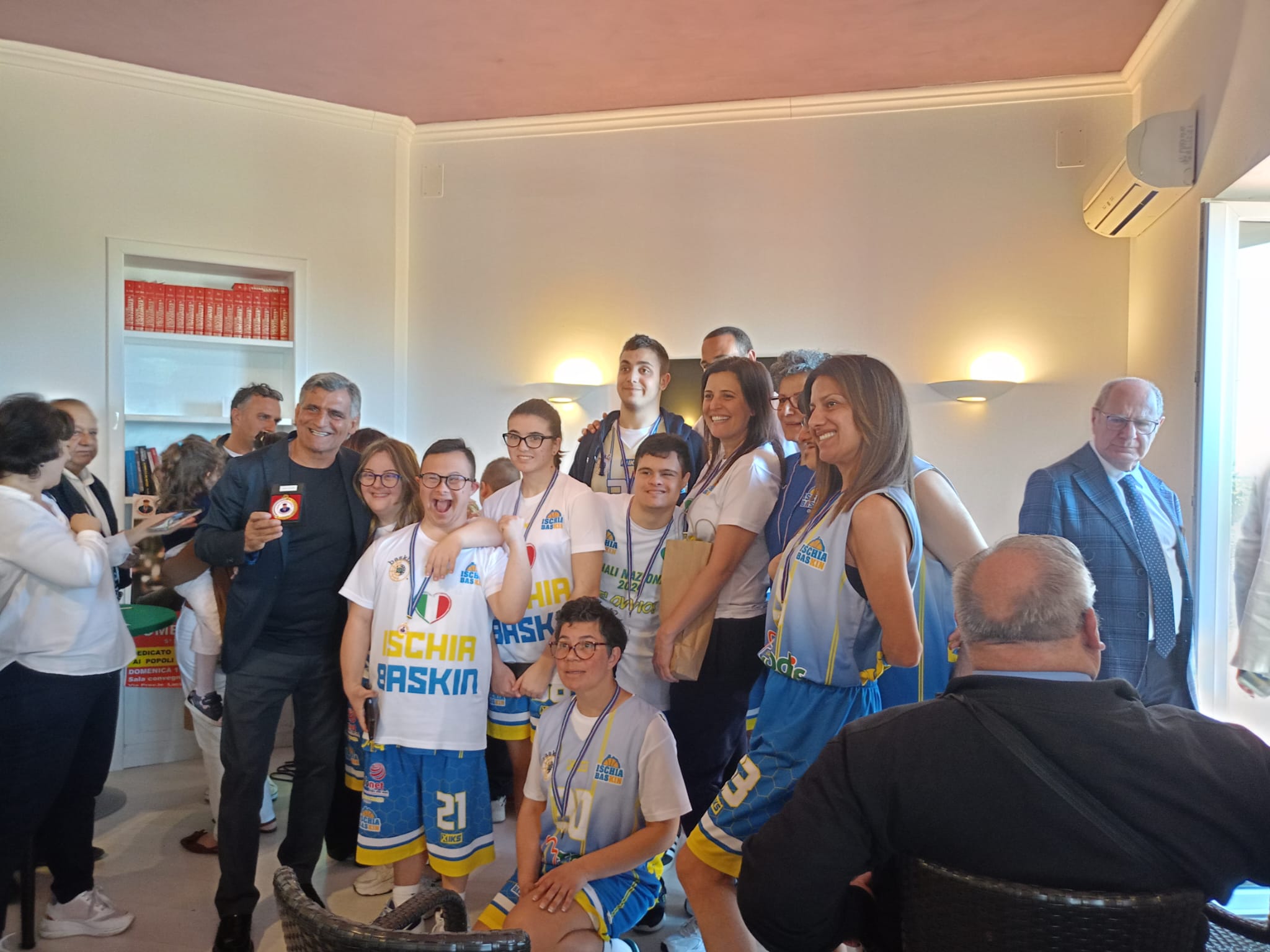 Sindaco di Bacoli Josi Gerardo Della Ragione e la squadra Ischia Baskin, simbolo